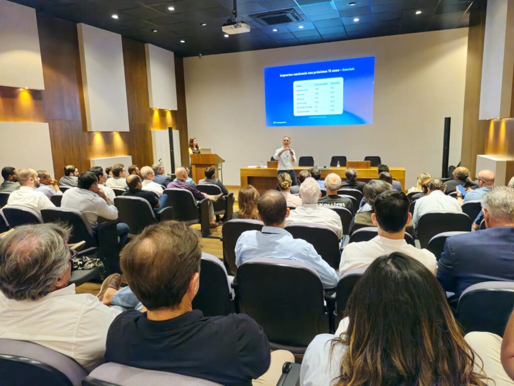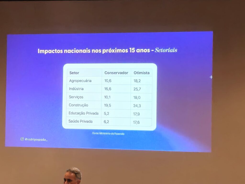 No recorte por setores, o agronegócio deve crescer 10,6% com a reforma. Embora abaixo da média geral, o desempenho reforça a força do setor, que já é altamente competitivo no cenário global. Spada destacou que o Agro brasileiro “ganha de lavada” em diversos mercados, sustentado por vocação natural, escala e eficiência produtiva.